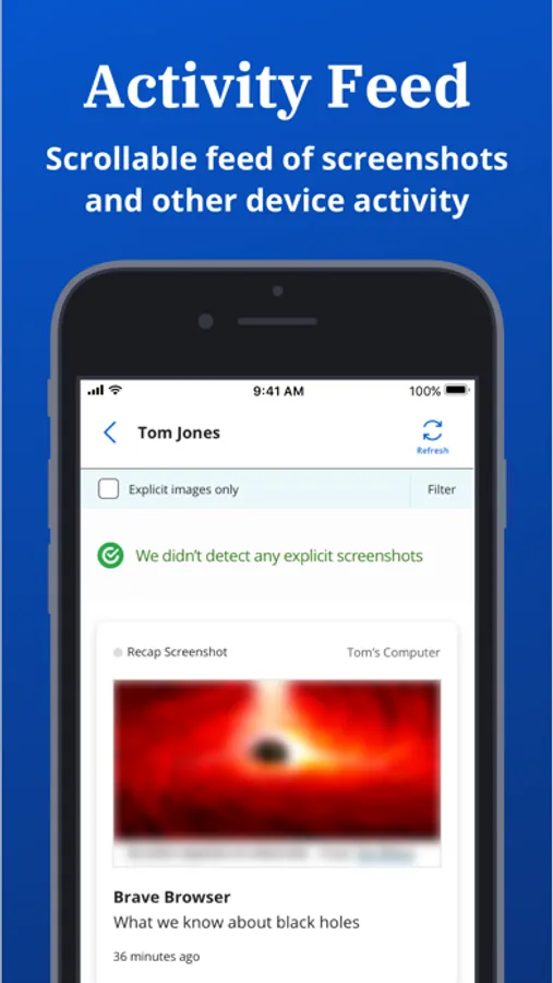 Activity feed allows you to see blurred Screen Accountability images of your device activity, inspect concerning ones, and sort them by image rating and device used
