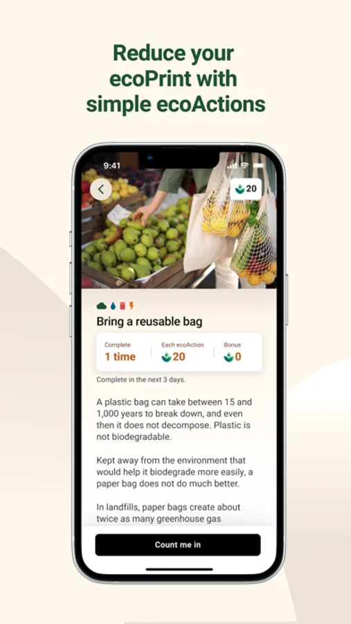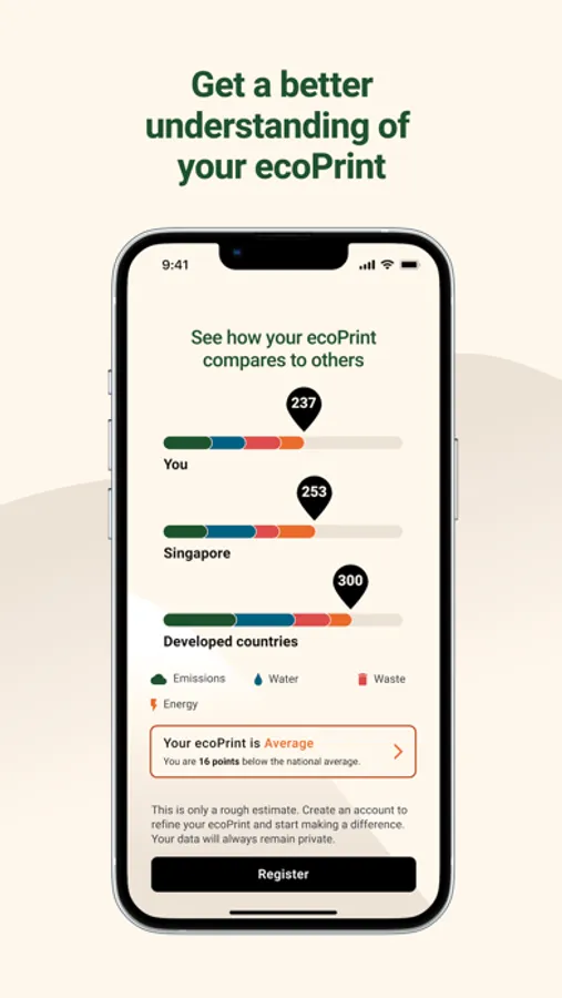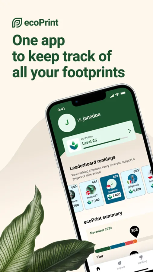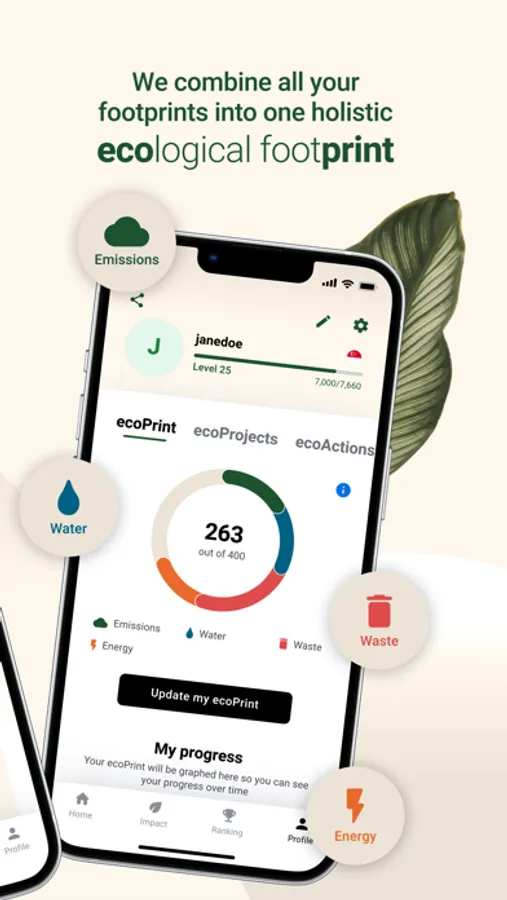 Understand your environmental footprint. ecoPrint breaks it down into carbon footprint, water footprint, energy footprint and waste footprint, providing a more comprehensive picture of your impact on the environment.