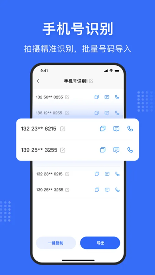 【手机号码识别】 提供号码快速识别功能,快速拍照或本地导入,即可一键识别!
