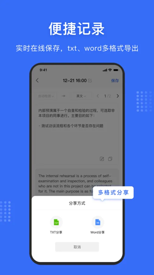 【录音转文字】 支持实时录音识别,将录音实时文字提取;支持导入手机系统中的录音,然后将录音文件转换成文字,极大的提高了您的工作和学习效率!