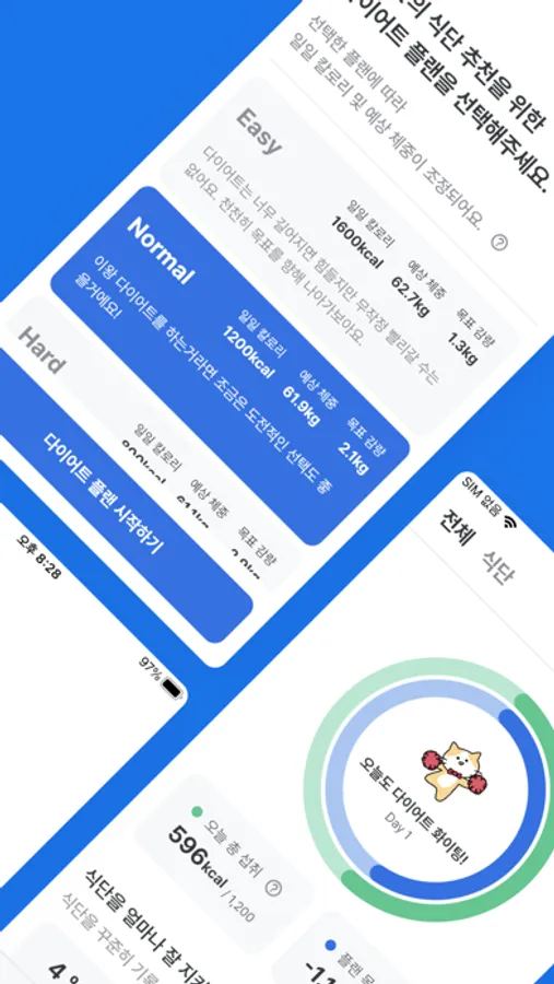 나의 신장, 체중, 평소 활동량 등 기본적인 정보를 입력하면 나에게 맞는 '2주'간의 다이어트 플랜을 세워줘요. 다이어트 플랜은 EASY, NORMAL, HARD 단계가 있어 다이어트하고 싶은 속도에 따라 플랜을 선택할 수 있어요.