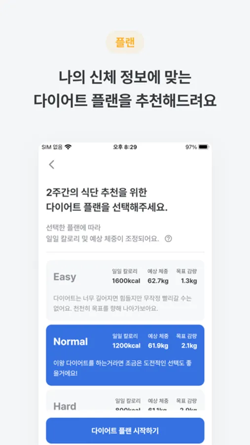 HARD 플랜을 선택한다면, 힘든 여정이 기대되지만 그만큼 다이어트를 빠르게 할 수 있겠죠?