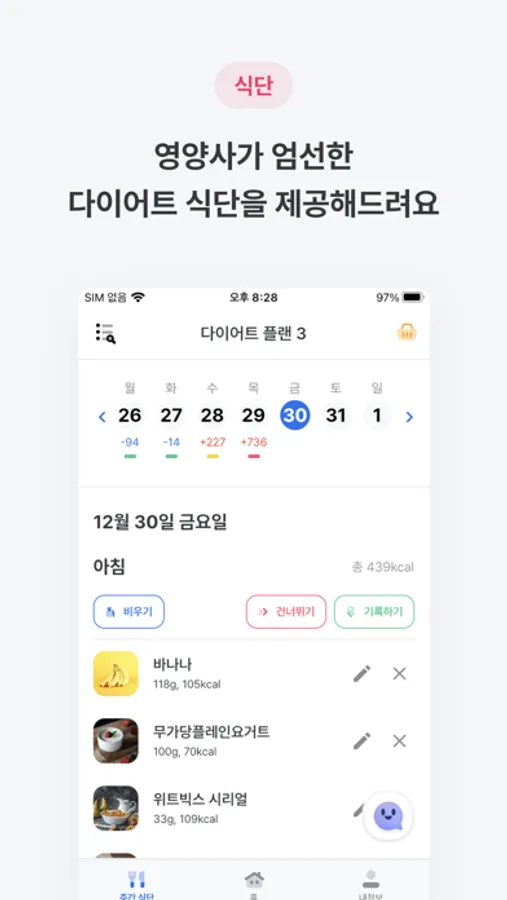 혹시 식단대로 먹기 힘드신가요? 괜찮아요! 자유롭게 식단을 나에게 맞게 수정할 수 있어요.