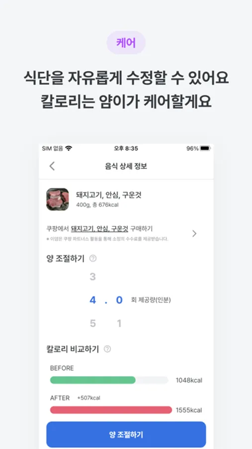 음식의 양을 올리거나, 음식을 추가하는 것이 불안한가요? 이것도 괜찮아요! 식단을 수정했을 때, 하루에 섭취하는 칼로리가 너무 높아진다면 얌이가 미리 경고해줍니다! 얌이의 도움을 받으면서 자유롭게 나만의 식단을 만들어봐요~