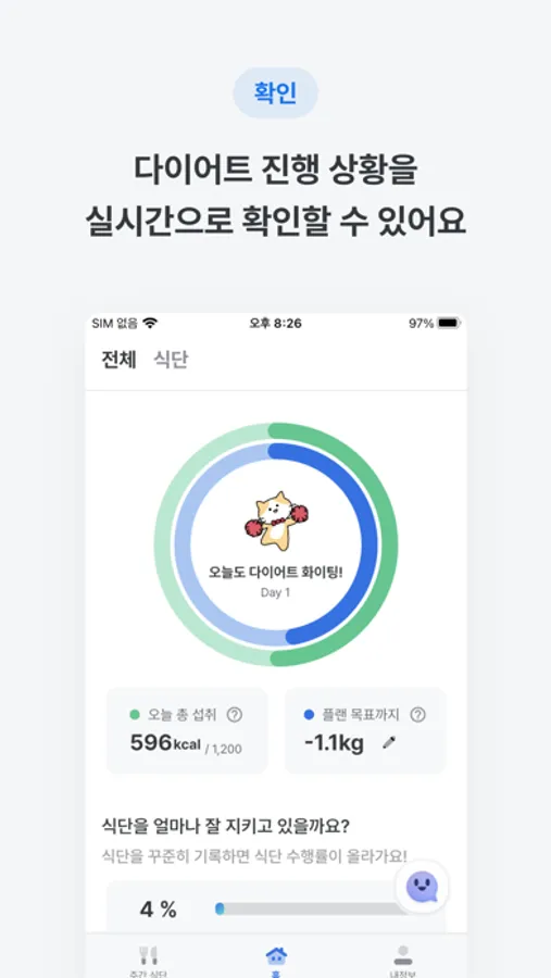 한번의 터치 만으로 식사를 기록할 수 있어요.