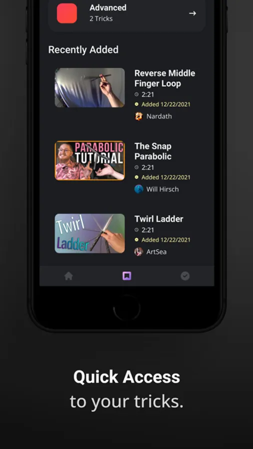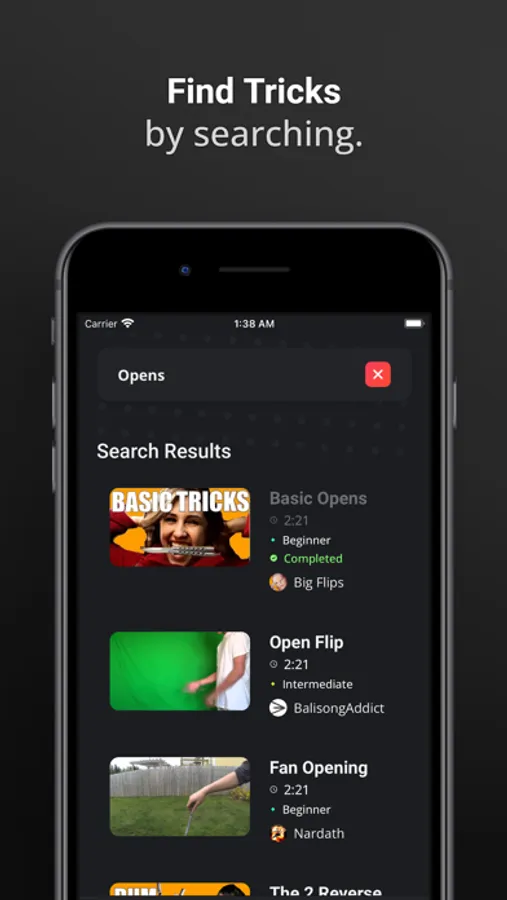 Balisong Mastery empowers flippers to easily sort through tricks published by their favorite creators. Search for tricks by name, or view tricks categorized by difficulty and instructor while having tools to mark them for quick access. Tutorials open with YouTube for the best experience.