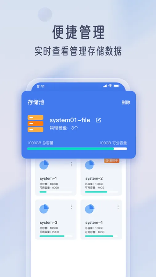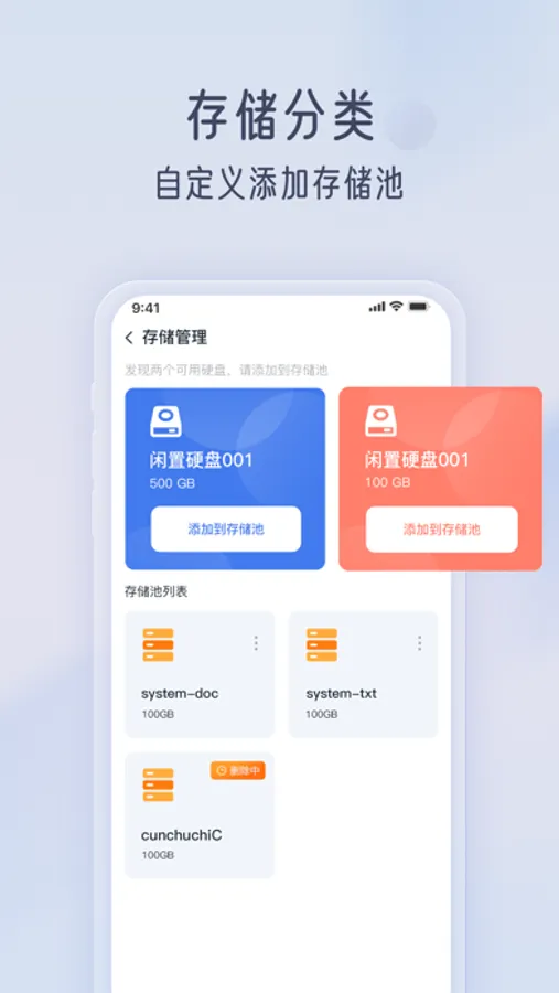 智汀云盘可接入存储硬件,扩大存储空间,分池分区管理,灵活分配不同用途的存储空间。