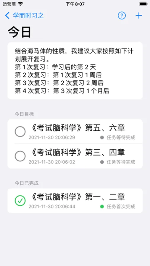 终于可以自己定学习任务了,而不是只是什么背单词之类的,所有的任务都会按照科学的时间周期自动提醒您进行复习回顾,加深记忆。