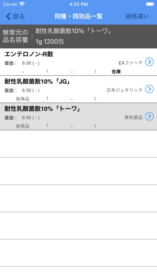 「同種・同効品一覧」から商品の包装単位別の在庫を確認できます。
