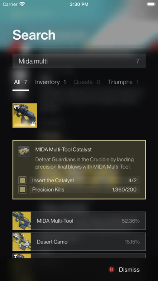 App-wide search for when you're looking for a triumph, collectible, quest item, or inventory item