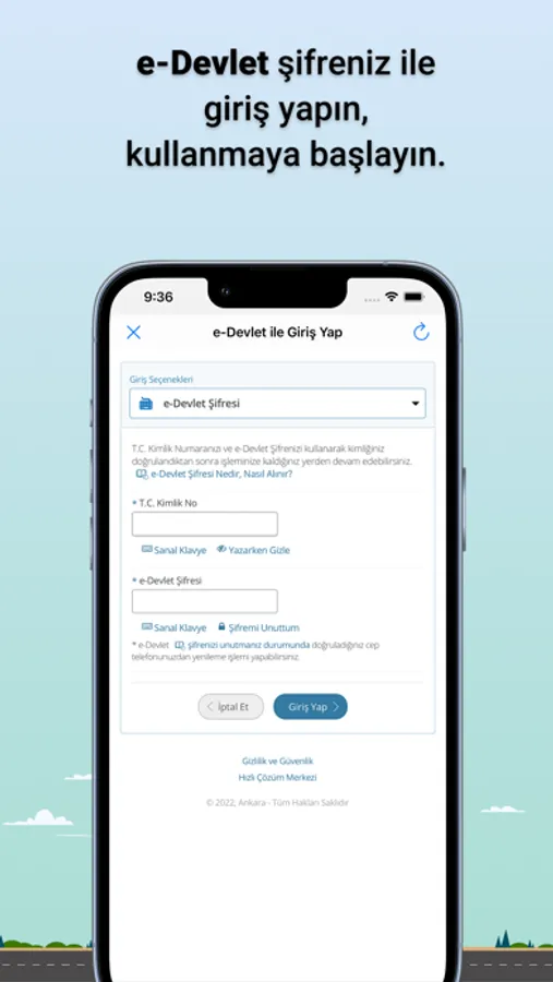 - E-devlet kullanıcı bilgileriniz ile giriş yaparak hesabınızı oluşturun. Hesabınız için bir şifre tanımlayarak uygulamaya girişinizi hızlandırabilirsiniz.