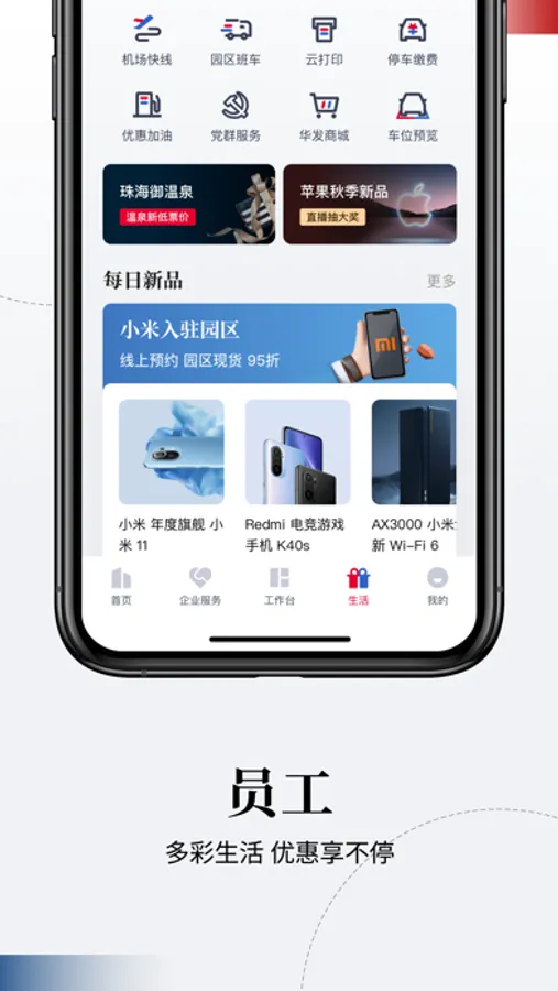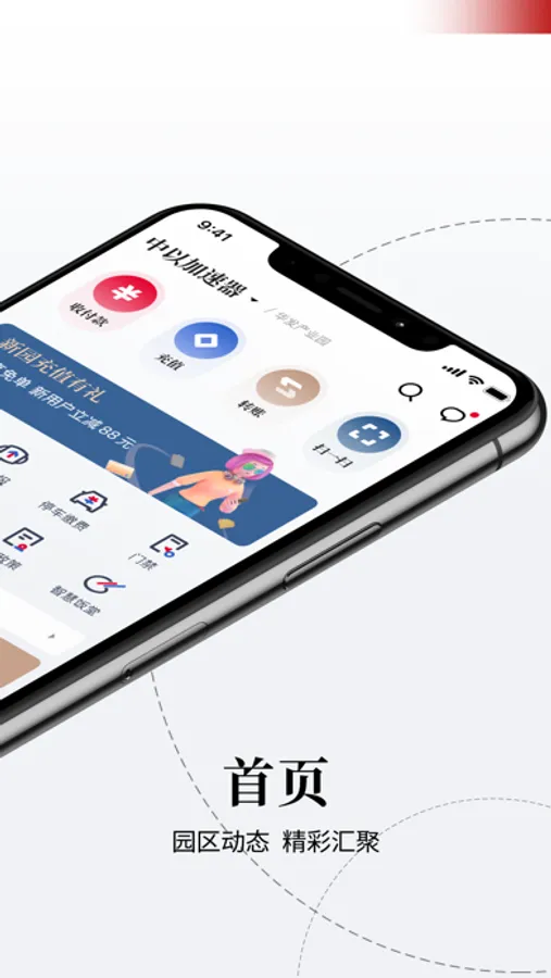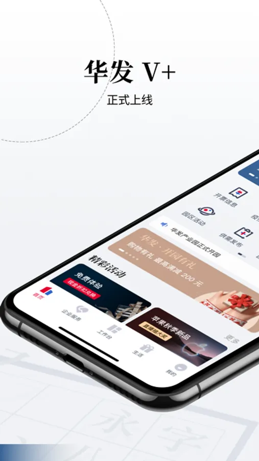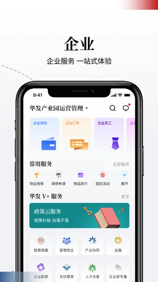 华发V+,智慧园区,园区动态精彩汇聚,企业服务一站式体验,员工多彩生活,优惠享不停。