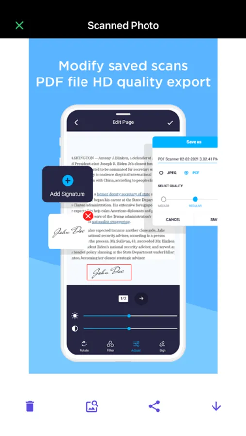 Why use another app when you can simply scan your ids, business cards, receipts, notes, taxes, faxes, photos, pictures, manuscripts in one single document editor. You can also keep all your data saved in this app and download it on your phone too. Save and share documents in JPEG or PDF formats with your desired people. Also, recheck or crop your documents with our inbuilt photo and document editor that works just for free. Use fantastic editing tools to polish your documents and make them look real.