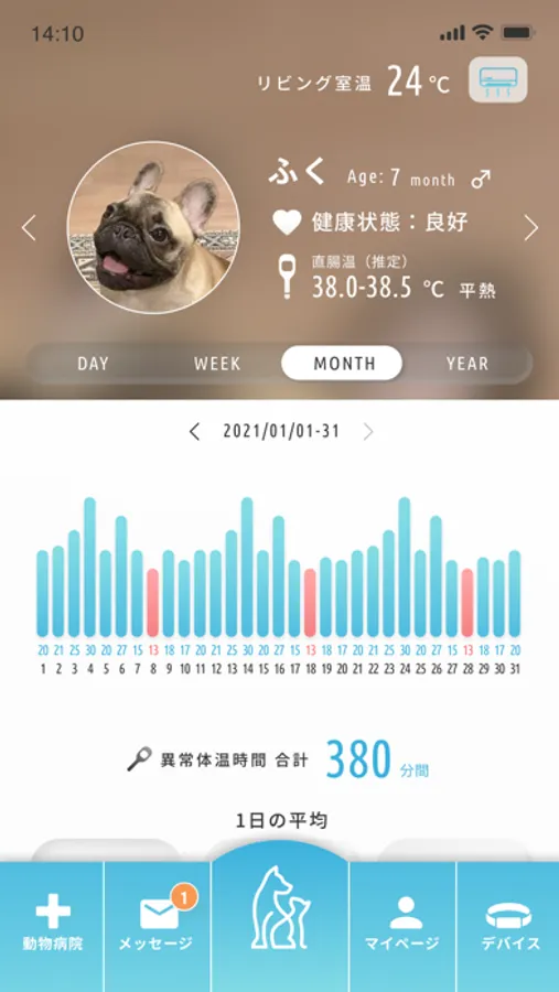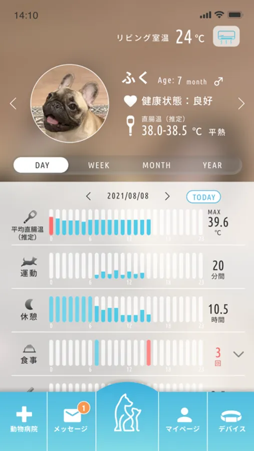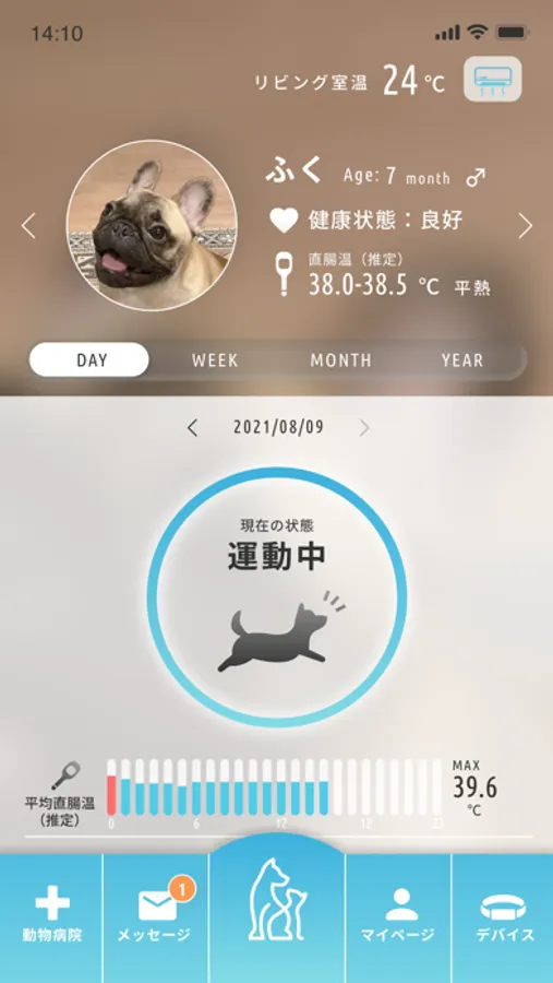 専用デバイスには、スマホと同スペックの高精度9軸センサーを採用。トイレ、食事、水飲みなどの回数、活動量をチェック。また日本で初めて温度センサーを内蔵して直腸温を推定。いつでもアプリで見ることができます。