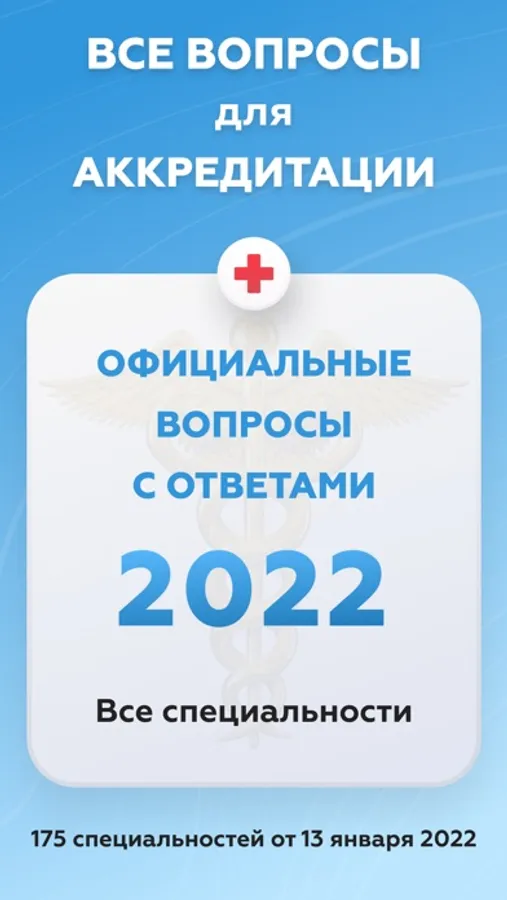 В приложении доступна самая актуальная база вопросов по всем специальностям. База обновлена в декабре 2021 года. Доступны все направления для подготовки к аккредитации.