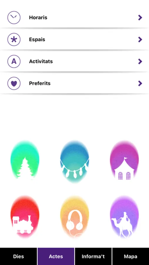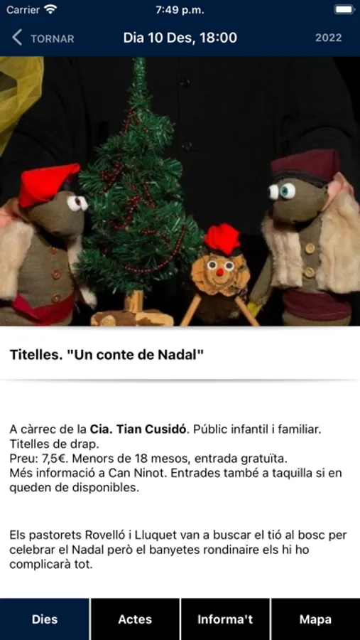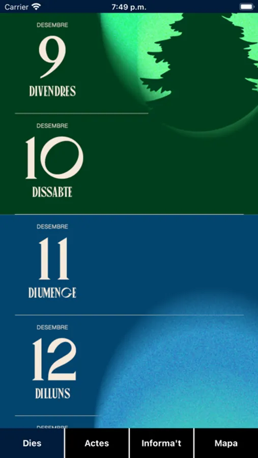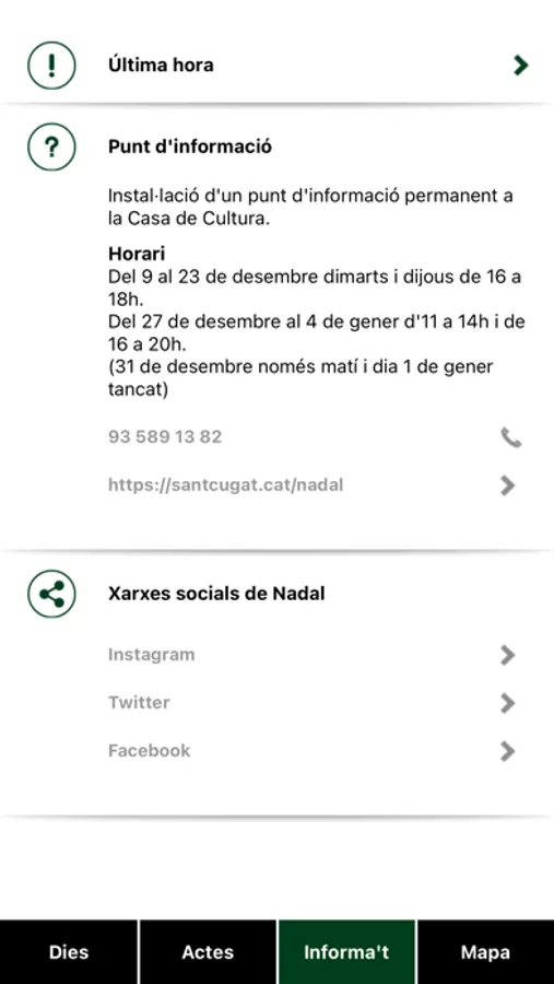 Podràs consultar tota la informació referent al Nadal de Sant Cugat del Vallès, a partir de les quatre seccions principals: dies, actes informa't i mapa.