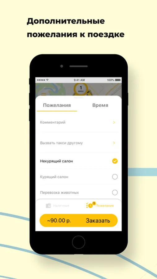 Добавьте к заказу дополнительные пожелания. Например, если вам нужен свободный багажник для вещей. Ил вы не переносите запах табака — укажите "Некурящий салон", и к вам приедет некурящий водитель. Или, если вам