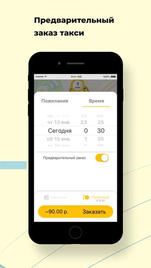 Выберите опцию “Предварительный заказ”. Поиск автомобиля начнется незадолго до заказа поездки, и автомобиль приедет к назначенному времени. Также вы будете заранее знать стоимость поездки.