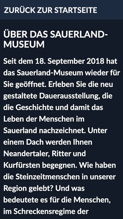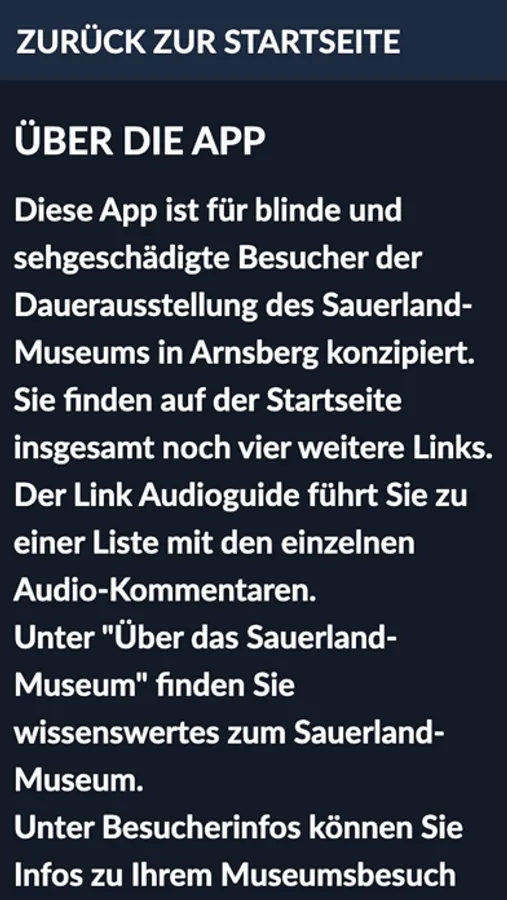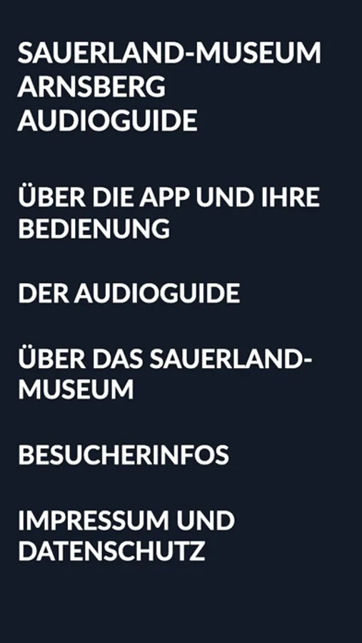 Die offizielle App für blinde und sehgeschädigte Besucher des Sauerland-Museums in Arnsberg, das die Geschichte des ehemaligen Herzogtums Westfalen von den Anfängen bis in die Gegenwart thematisiert.