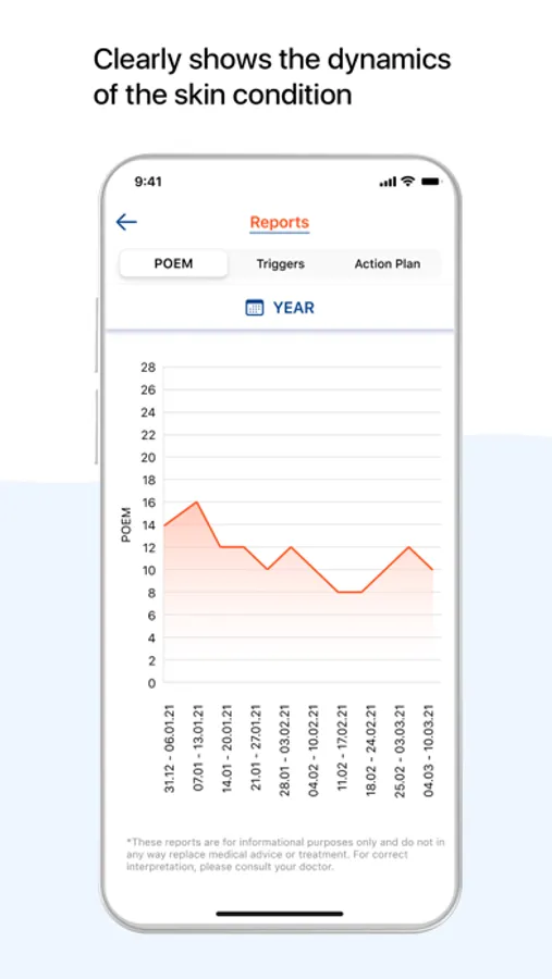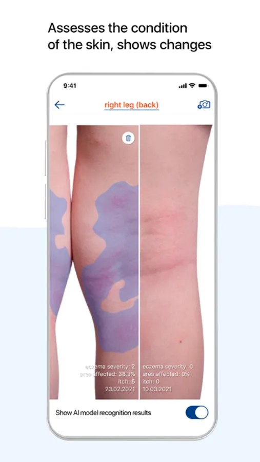 • The app's artificial intelligence model will show you which areas of the skin are affected and will assess the severity of eczema*.