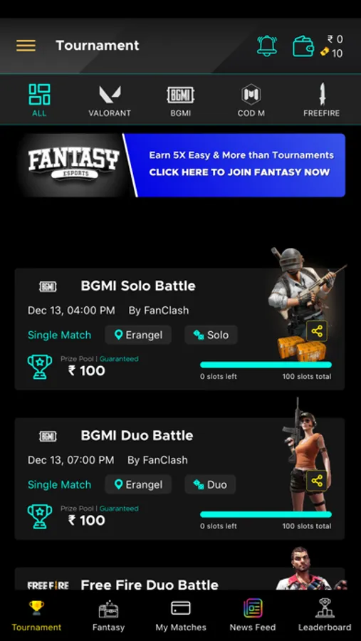 We conduct Fantasy on COD, PubG, FreeFire, Valorant, CS:GO, BGMI.