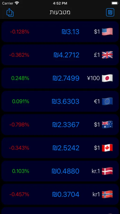 הצגת שערי מטבעות ומחשבון המרת מט״ח.