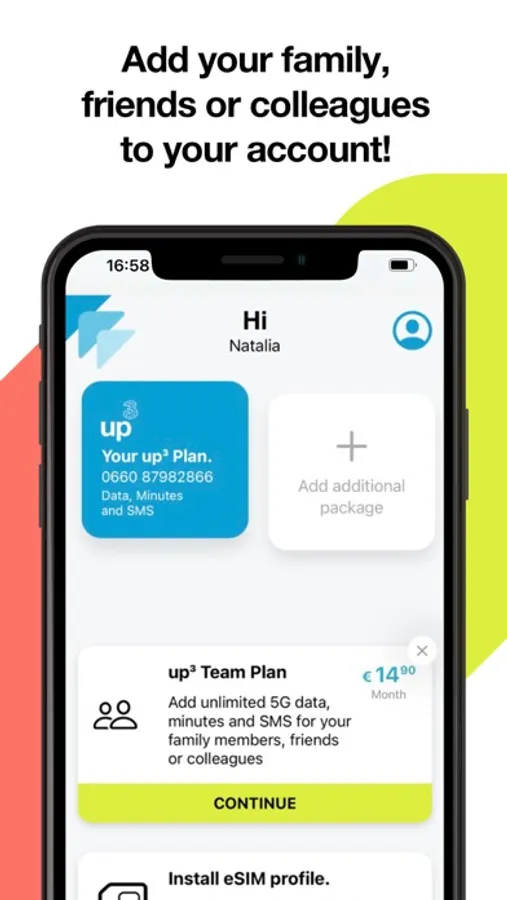 Your up3 plan can be upgraded at any time: Add family members, friends or colleagues to your account to activate unlimited 5G data, minutes and SMS for them as well.