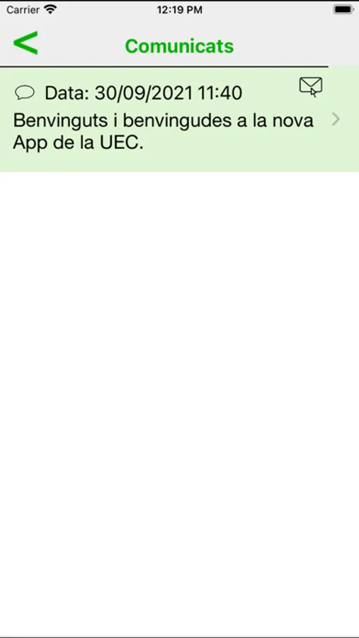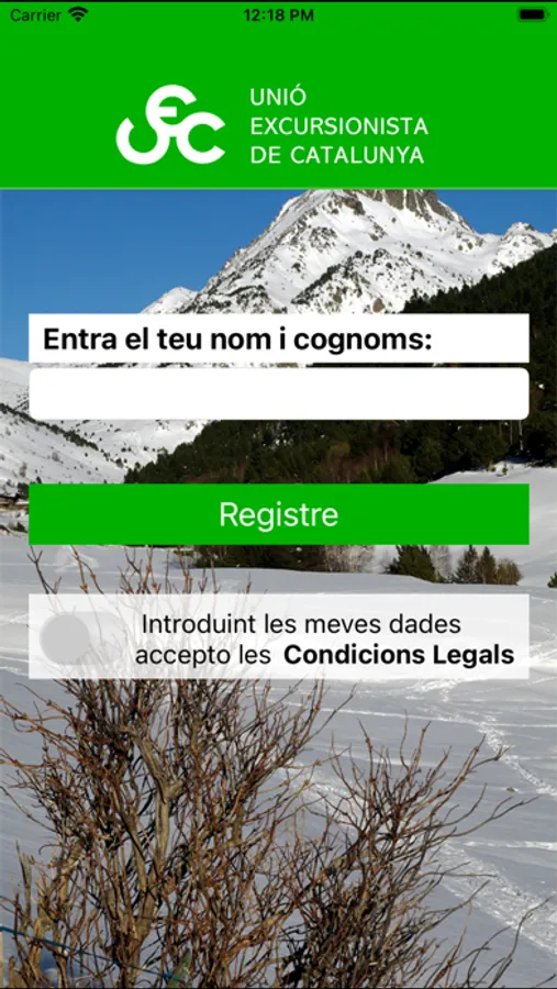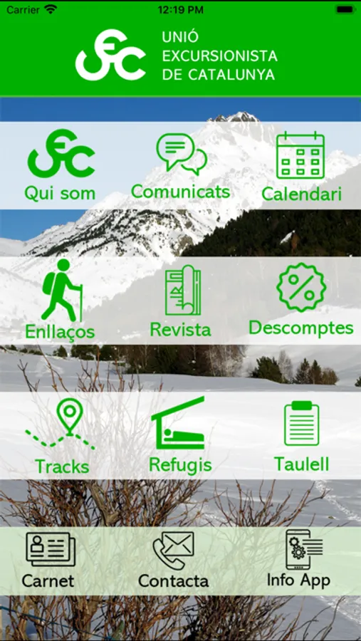 App de la Unió Excursionista Catalunya (UEC). L'aplicació permet una comunicació directa entre el centre i els usuaris. El menú consta de diverses opcions: Qui som, Comunicats, Calendari, Enllaços, Revista, Descomptes, Tracks, Refugi, Taulell. A la barra inferior hi ha la secció Carnet, Contacta, Info App.