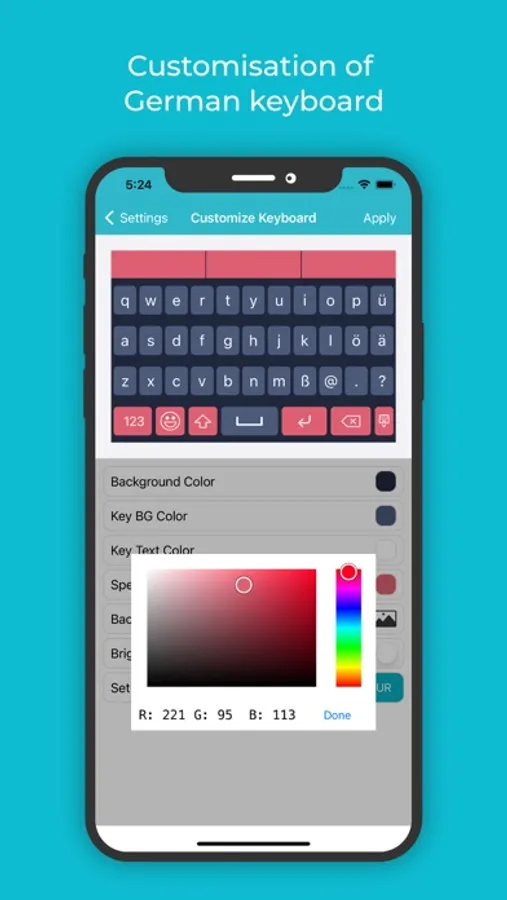 • Change colours for the Background colour, Key background colour, Keyboard text colour, Suggestion box colour etc, so that typing does not seem boring and monotonous with this German keyboard for iOS.
