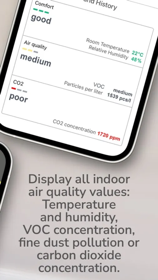 • Display of the indoor air quality values detected by the air purifier, such as temperature and humidity, VOC concentration, fine dust pollution level (PM1) or carbon dioxide