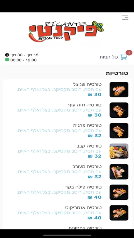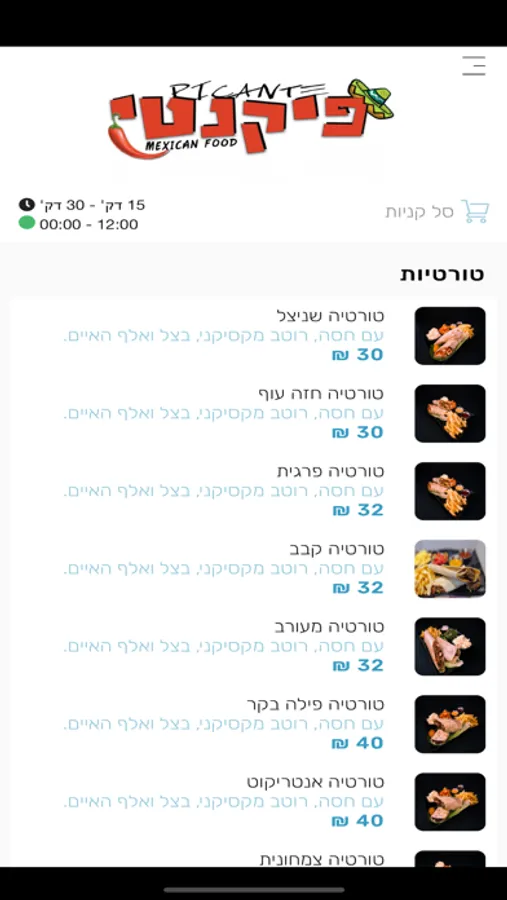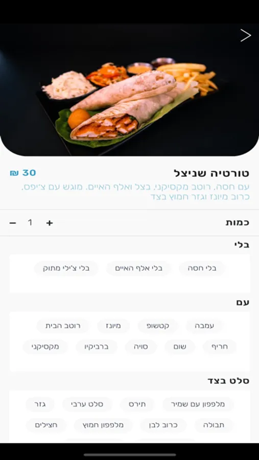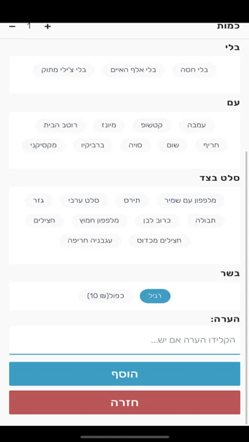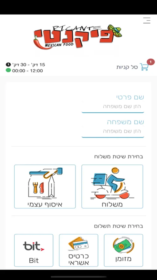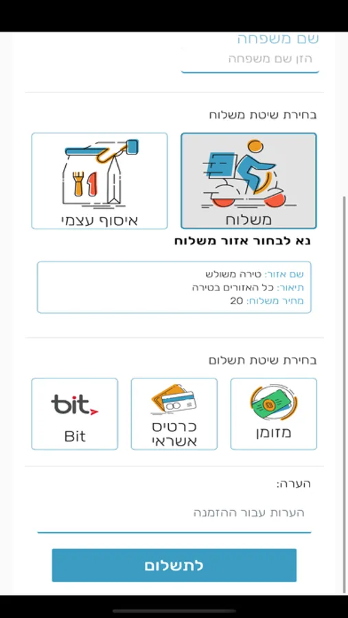 בניית הזמנה, בחירת מנות.אפשרות למשלוח או איסוף.מגוון אפשריות תשלום.