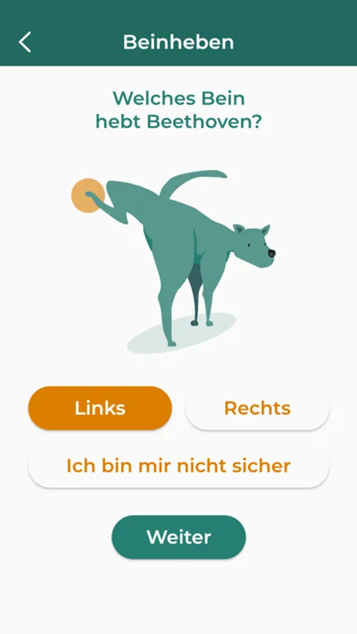 Zu Beginn der WAU-App werden generelle Informationen zu Deinem Hund und dessen Persönlichkeit erfragt. Anschließend kannst Du das lateralisierte Verhalten Deines Hundes mithilfe der App dokumentieren (z.B.: welches Bein hebt Dein Hund beim Urinieren?). Nach jeder Beobachtung wirst Du weiterhin dazu aufgefordert eine Einschätzung bezüglich des emotionalen Zustands Deines Hundes zu geben. Und schon bist Du mit Deinem Hund Teil unserer Studie!