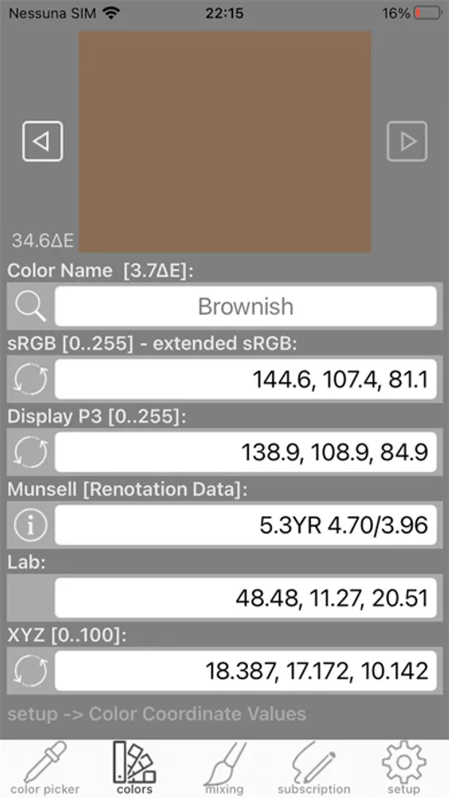 Many Color Spaces are included: sRGB, Display P3, CMYK, HSL, HSV/B, Lab, Lch-ab, Luv, Lch-uv, XYZ, xyY and Munsell coordinates. The Munsell coordinates are computed from the original and extrapolated Renotation Data with great precision even around the neutral axis.