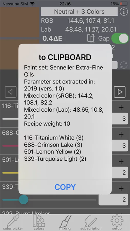 Please note that color of paint coming from various parts of a tube/jar or from different batches of the manufacturer can vary, so mix always small amounts first to be sure that computed recipes meet your needs!