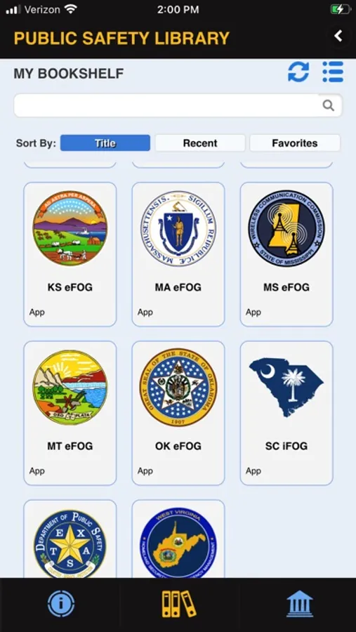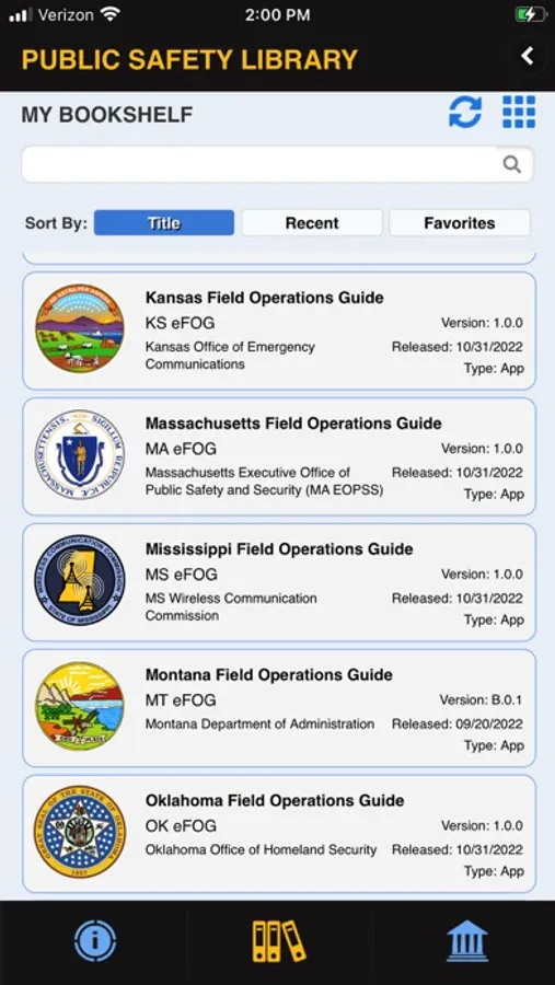 Public Safety Library enables users to store and access interoperable communications field operations information on their mobile devices. Electronic field operations guides (eFOGs) include rules and regulations for use of nationwide and other interoperability channels, tables of frequencies and standard channel names, and other reference material. These technical references are used for emergency communications planning and by radio technicians responsible for radios used in disaster response.