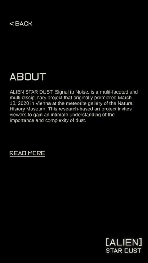 This app is part of the [Alien] Star Dust traveling exhibition, and is meant to be used in order to experience the installation. The app allows visitors to view 3D representations of historically significant meteorites with accompanying binaural sound.