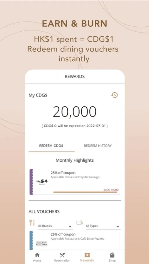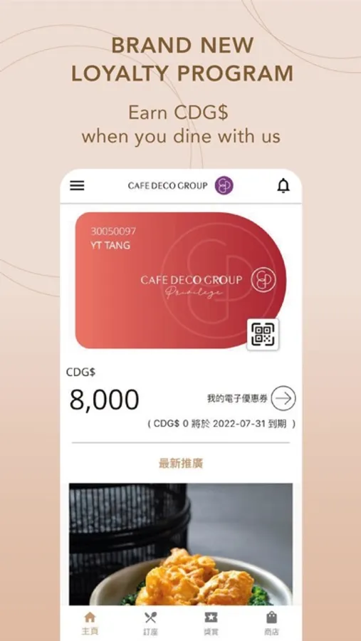 Cafe Deco Group (CDG) proudly presents CDG Privilege (CDGP) which is an app-based loyalty program designed to reward members with many benefits and to enhance their dining experience. Members can enjoy quadruple dining privileges that include: Welcome offers, birthday privileges, monthly highlight and surprise vouchers, as well as turning the spending at over 20 restaurants and bars into CDG$ for more exclusive vouchers by redemption. Members could also make reservations on the go and receive instant booking confirmation, which could all be done easily on the mobile app.