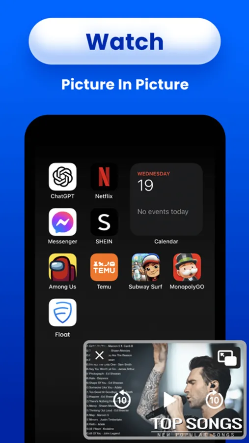 Picture in Picture mode. You can watch the video in floating play mode, which is also called pop-up player. Allow you to keep playing in Float and listen to the video while switching to other APP. What's more, you can drag the floating pop-up video window anywhere on the screen.