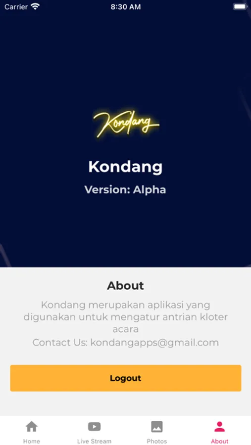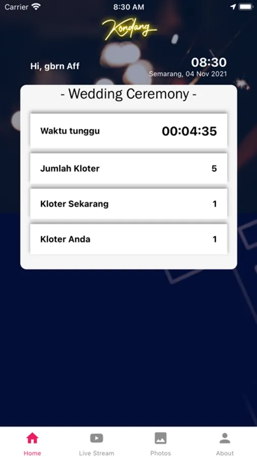 Kondang merupakan aplikasi pengelola antrian kloter pengunjung suatu acara. Aplikasi ini membantu Event Organizer atau Host untuk mengelola pengunjung yang masuk dengan cara membuat kloter