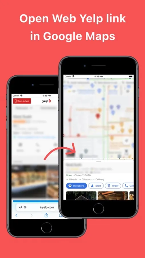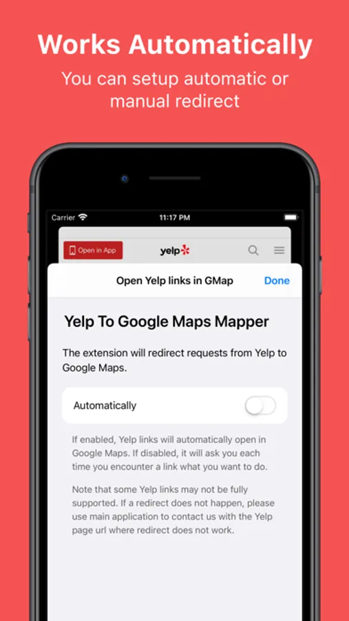 Y2G Mapper provides an option to automatically or manually redirect Yelp business pages to Google Maps. You can change settings in the app or in Safari extension settings page.