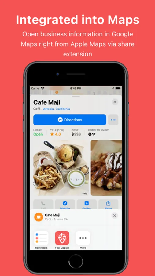 Y2G Mapper is a Safari extension that automatically redirects Yelp business links to Google Maps. With this extension, you can lookup businesses on Google Maps application without the need to copy/paste the name of a place anymore!