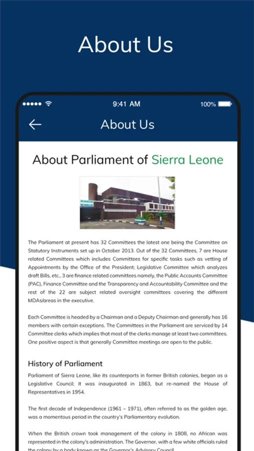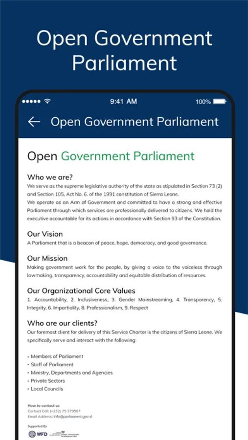This is Parliament of the Republic Sierra Leone mobile app to show-case and disseminates information about the core functions of Parliament activity which are Representation, Law Making, Oversight of the Executives and Budget scrutiny and allocation as delineated in the 1991 Constitution of Sierra Leone.