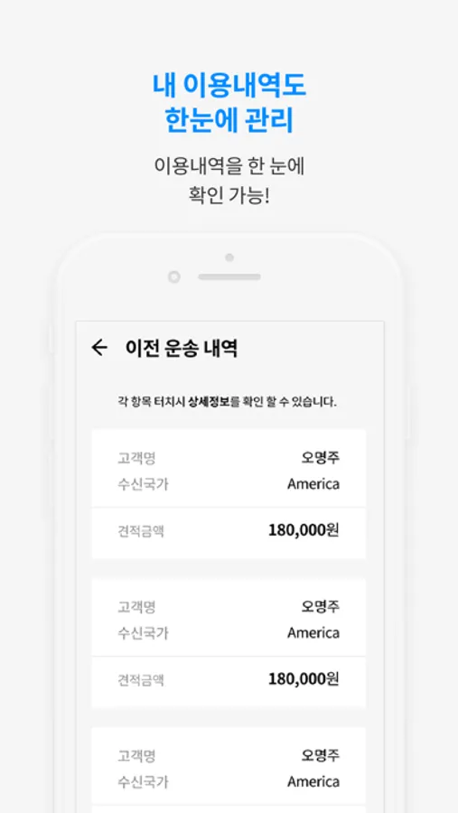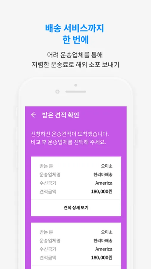 회원 가입하고 견적 신청만 하면 여러 해외 운송업체의 운송료를 비교하여 저렴한 운송료로 배송 서비스까지 한 번에 내 소포 이용 내역도 한눈에 관리.