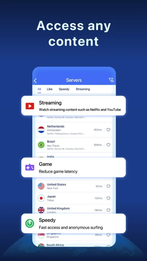 Don't allow slow internet speeds to hinder your online activities. Enjoy unlimited speed and bandwidth. With our built-in game and streaming acceleration servers, you get an unparalleled experience.