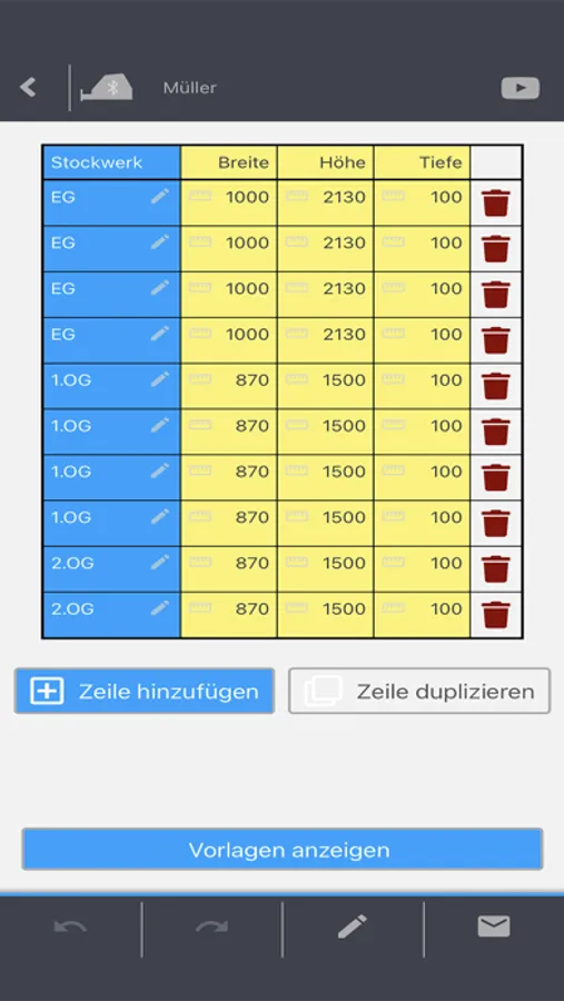 Die Solaflex-App wurde speziell für das Messen von Flächen entwickelt. Noch nie war es so einfach, ein digitales Aufmaß zu erstellen. Die App ist mit dem von Solaflex entwickelten, digitalen Rollmeter RX5 kompatibel. Diese Kombination erlaubt es, Messwerte direkt vom Rollmeter per Knopfdruck in die App zu übertragen und zeitgleich zu visualisieren. Die erstellten Zeichnungen und Tabellen können für den weiteren Produktionsverlauf bequem als DXF-, PDF- oder CSV-Datei exportiert werden. Mit dem digitalen Aufmaß-System von Solaflex werden Zeichnungen und Tabellen sofort digitalisiert.