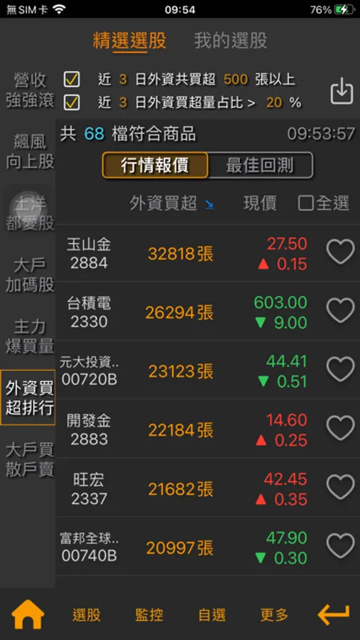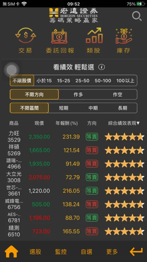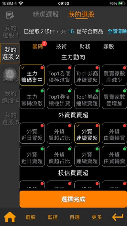 ● 專屬策略:四大類智能選股,100多個選股條件可依投資屬性自由搭配組合