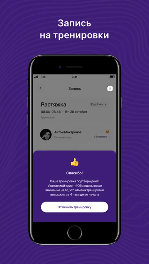 - Получать PUSH-уведомления о предстоящей тренировке за 3 часа;