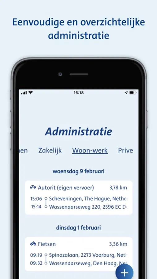 In de app komen al jouw gemaakte reizen terug. Onder Administratie krijg je een overzicht van alle gemaakte kosten ingedeeld in zakelijk, Woon-werk en privé. Onder ordenen komen de reizen te staan die je nog moet classificeren. Dit doe je eenvoudig door te swipen. Ook kan je in je persoonlijke instellingen locaties en werktijden instellen waarmee je het merendeel van de transacties automatisch kan laten classificeren.
