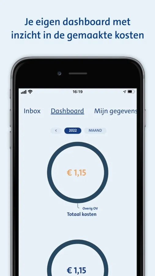In de app vind je jouw persoonlijke dashboard met inzicht in de gemaakte reizen en kosten. Zo heb je altijd grip op je reiskosten.