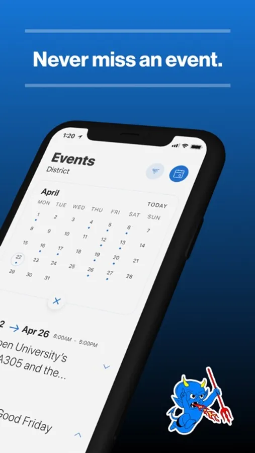 The event section shows a list of events throughout the district. Users can add an event to their calendar to share the event with friends and family with one tap.